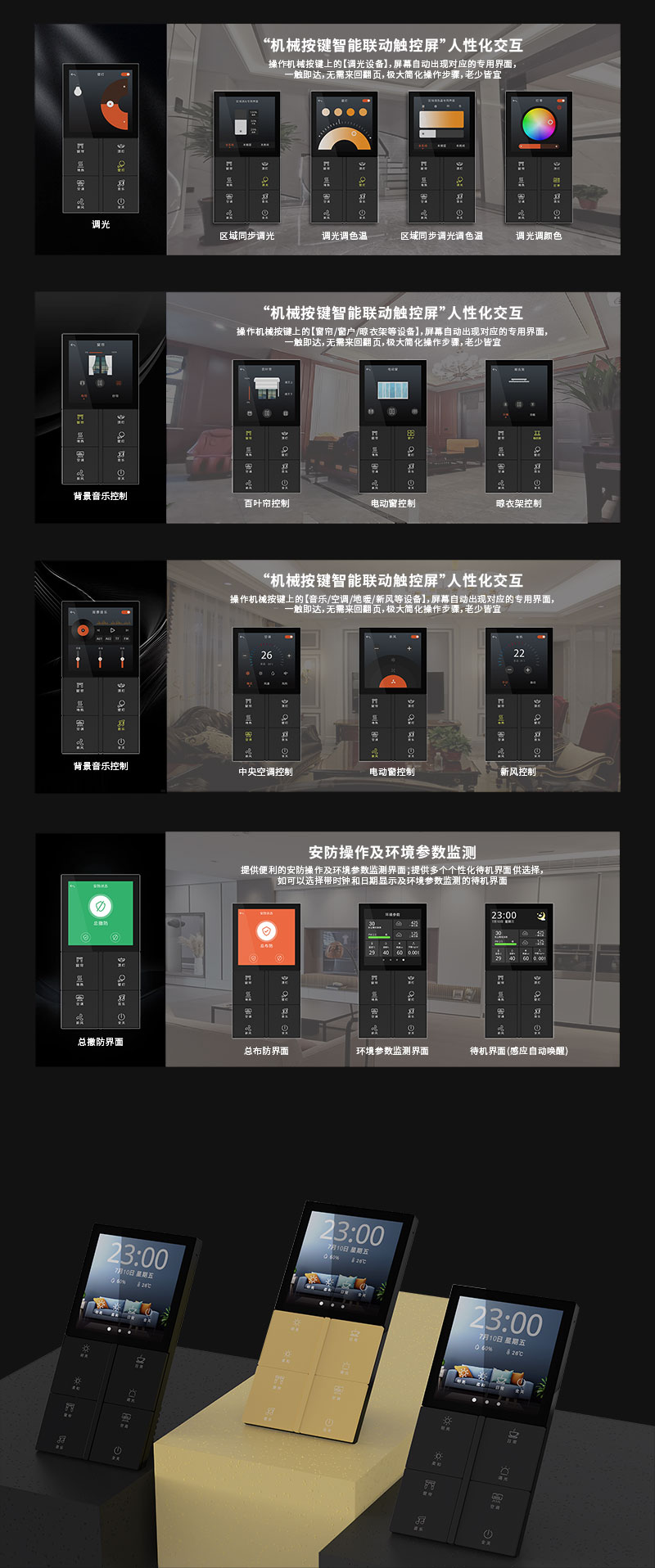 - 屏幕二級(jí)界面:操作機(jī)械按鍵上的【調(diào)光/窗簾/音樂/空調(diào)/地暖/新風(fēng)/安防/環(huán)境等】對象,屏幕自動(dòng)出現(xiàn)對應(yīng)的專用界面,一觸即達(dá),無需來回翻頁,極大簡化操作步驟,老少皆宜,業(yè)界首創(chuàng)