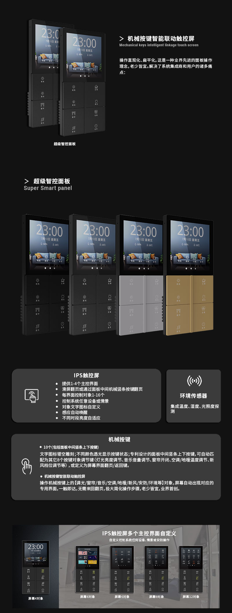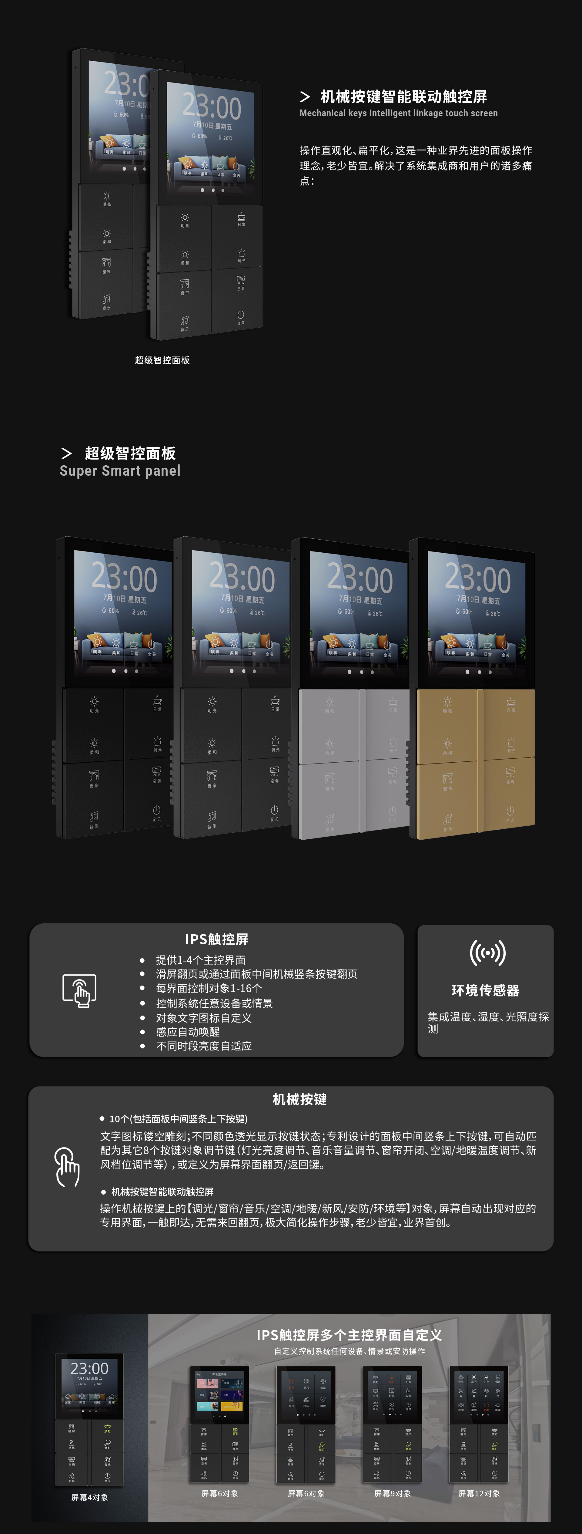 - 屏幕亮度:每天三個(gè)自定義時(shí)段自動(dòng)調(diào)節(jié)明暗(臥室面板可設(shè)置睡眠后自動(dòng)關(guān)閉屏幕及按鍵背光)