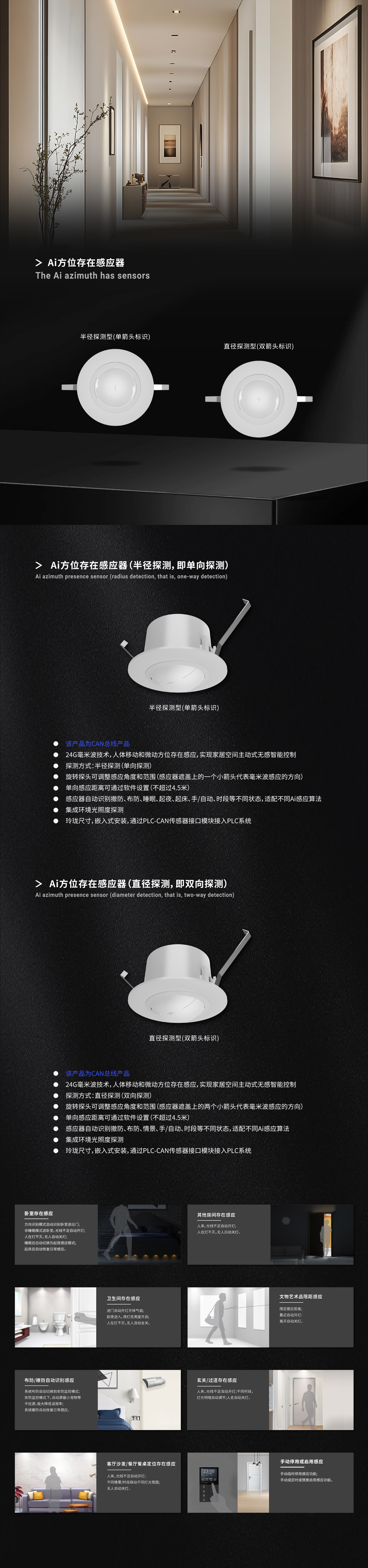 內(nèi)置24G毫米波感應(yīng)探頭,高靈敏人體移動(dòng)和微動(dòng)方位存在感應(yīng),應(yīng)用于衛(wèi)生間、衣帽間、臥室、書(shū)房、廚房等需要長(zhǎng)時(shí)間駐留空間的人體方位存在感應(yīng),實(shí)現(xiàn)家居空間主動(dòng)式無(wú)感智能控制;集成光照度探測(cè);通過(guò)PLC-CAN傳感器接口模塊(“PLC-X-CAN/AiSensor”型號(hào))接入PLC系統(tǒng)。